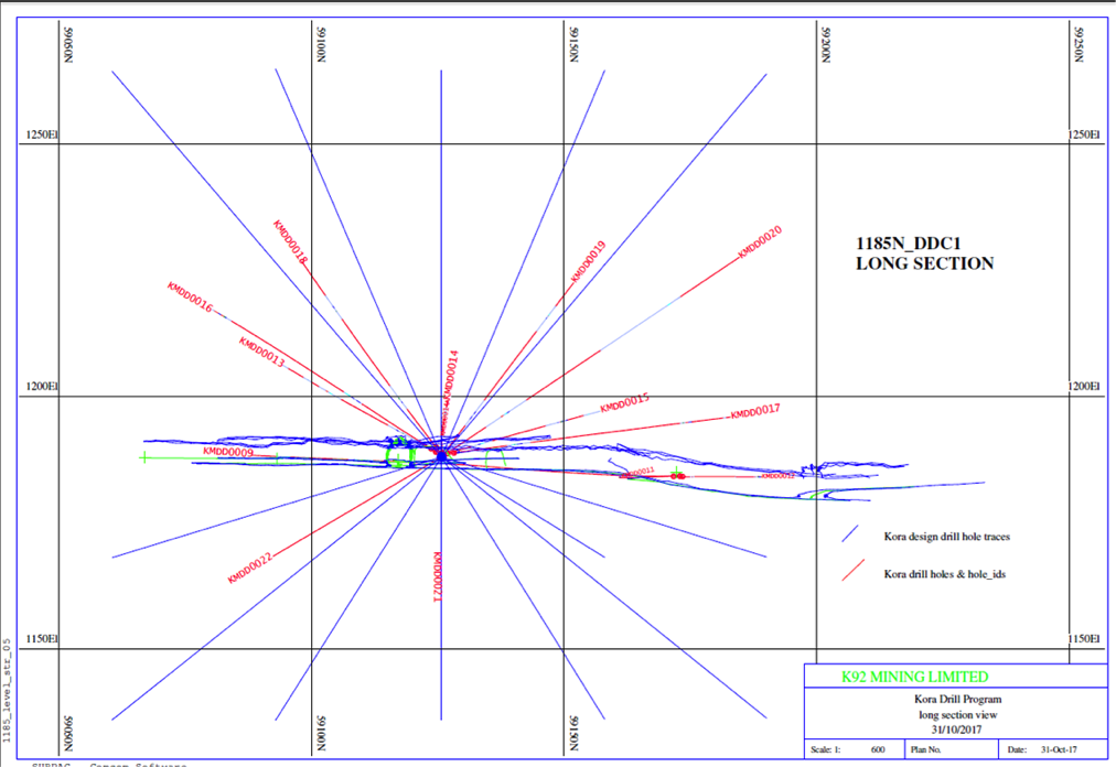 Following on from the success of the results from this drive and the 25m x 25m “grade control” grid pattern K92 has completed initial mine designs for this area which include access to, and drives along the vein on the 1210 mRL and 1235 mRL. This will enable the first stopes to be mined from this Kora Northern Extension in early 2018.