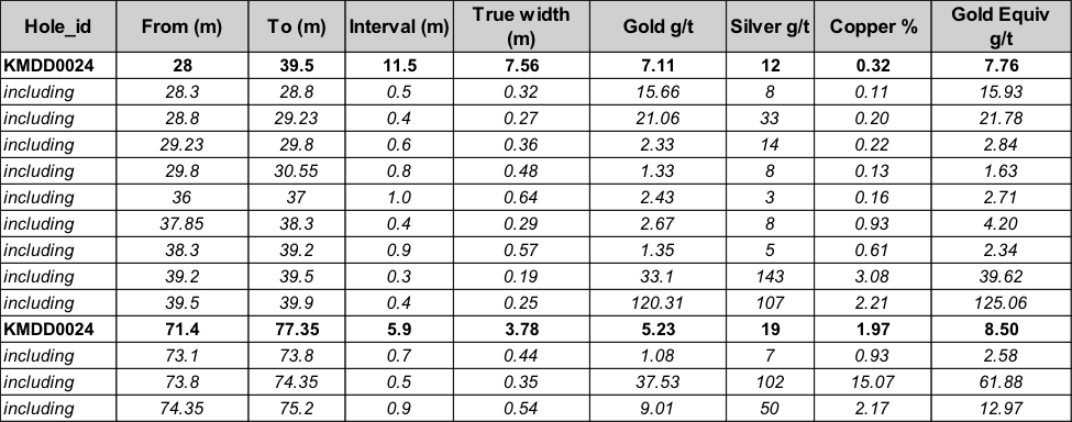 - Drill Hole KMDD0024 records 11.5 m at 11 g/t Au, 12 g/t Ag and 0.32% Cu (7.76 g/t AuEq) plus 5.95m at 5.23 g/t Au, 19 g/t Ag and 1.97% Cu (8.50 g/t AuEq)