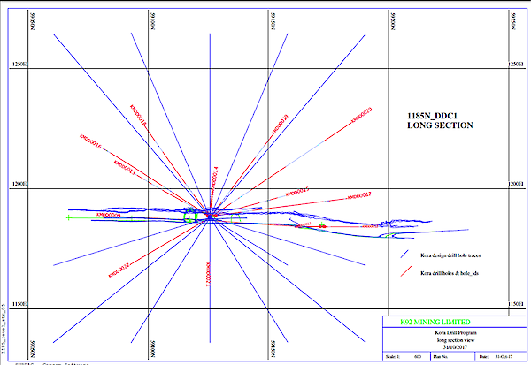 K92 is currently undertaking a program of 24 drill holes from underground drill cuddy DDC1 located approximately 50 metres from the Kora Vein at 59125 North, 29876 East and 1188 mRL (see Figure 1). This program which will be completed in December, is designed to drill out an area of approximately 150 metres by 150 metres on a 25m x 25m “grade control” grid pattern.