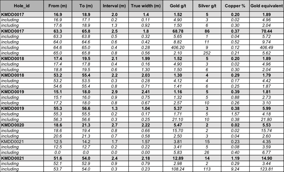 - 2.5m at 68.78 g/t Au, 86 g/t Ag and 0.37% Cu (70.44 g/t AuEq), including 0.4m at 406.2 g/t Au, 9 g/t Ag and 0.12% Cu in drill hole KMDD0017