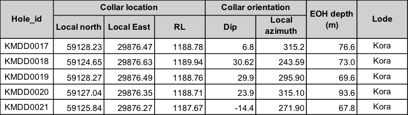 Table 1 and 2 below provides a summary of the results from the five diamond grade control which have been drilled into the Kora Vein. Table 1 provides a summary of the significant intercepts from the holes, while Table 2 provides details of collar location and hole orientation.