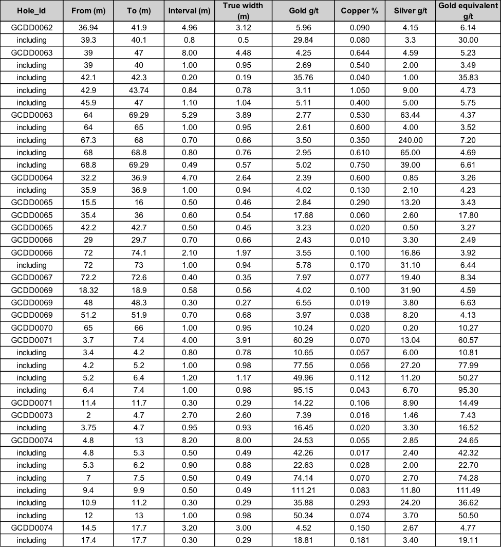 - 4m at 60.57 g/t AuEq, including 1m at 77.99 g/t AuEq and 1m @ 95.30 g/t AuEq, plus 0.3m at 14.49 g/t AuEq in hole GCDD0071