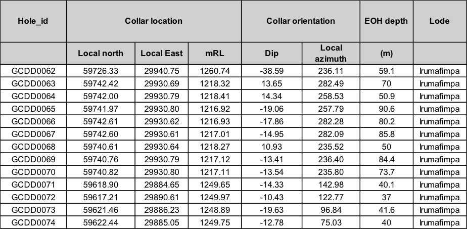 Table 1 and 2 below provides a summary of the results from eleven diamond grade control which have been drilled into stope areas. Table 1 provides a summary of the significant intercepts from the holes, while Table 2 provides details of collar location and hole orientation.