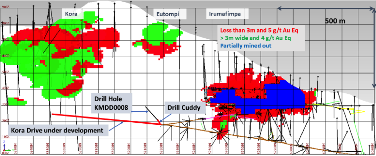 This series of drill holes are being drilled from the first drill cuddy established at approximately 59200 North on the Kora Drive as shown in Figure 1 below. The first drill hole, KMDD0008, is targeting an area approximately 700 metres along strike from, and to the north of the known Kora Deposit.