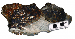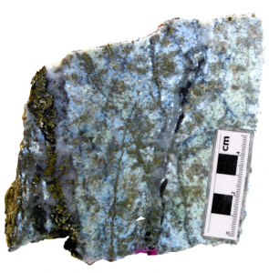 Fig. 1. Sample 016679 (UTM coords 371432E, 9316125N) Enargite-luzonite rich hydrothermal breccia matrix, with silicified dacite clasts, overprinted by kaolinite; 8.33 g/t Au, 47.6 g/t Ag, 14.94 % Cu.