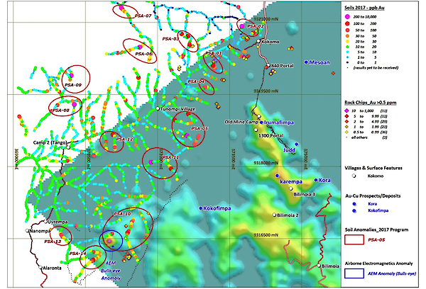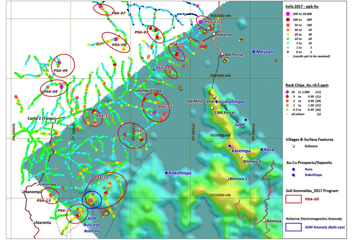 Fig. 3. Blue Lake rock chip Au assays over Au in soils (Pomasi) and AEM geophysics. Note location of prominent EM anomaly in PSA-10.